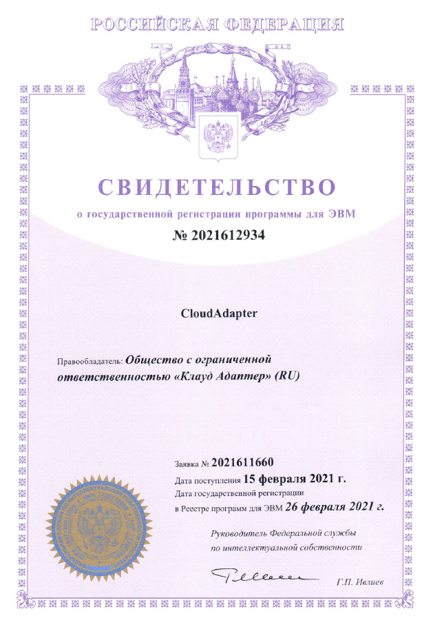 Свидетельство о регистрации решения CloudAdapter